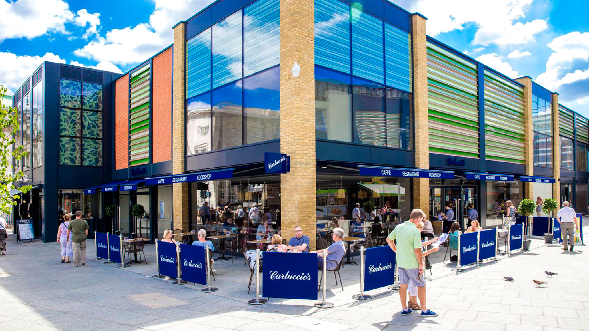 The scheme remodels existing buildings, introduces a vibrant and interesting façade, new centre entrance and a landscaped public realm area. Five new restaurants with external seating occupy the attractive space.